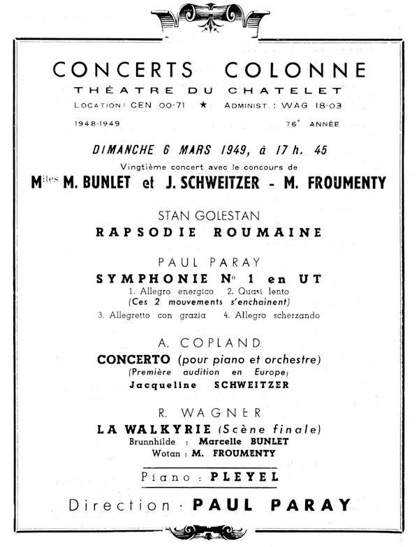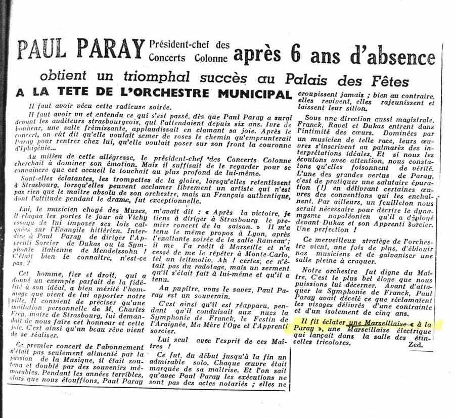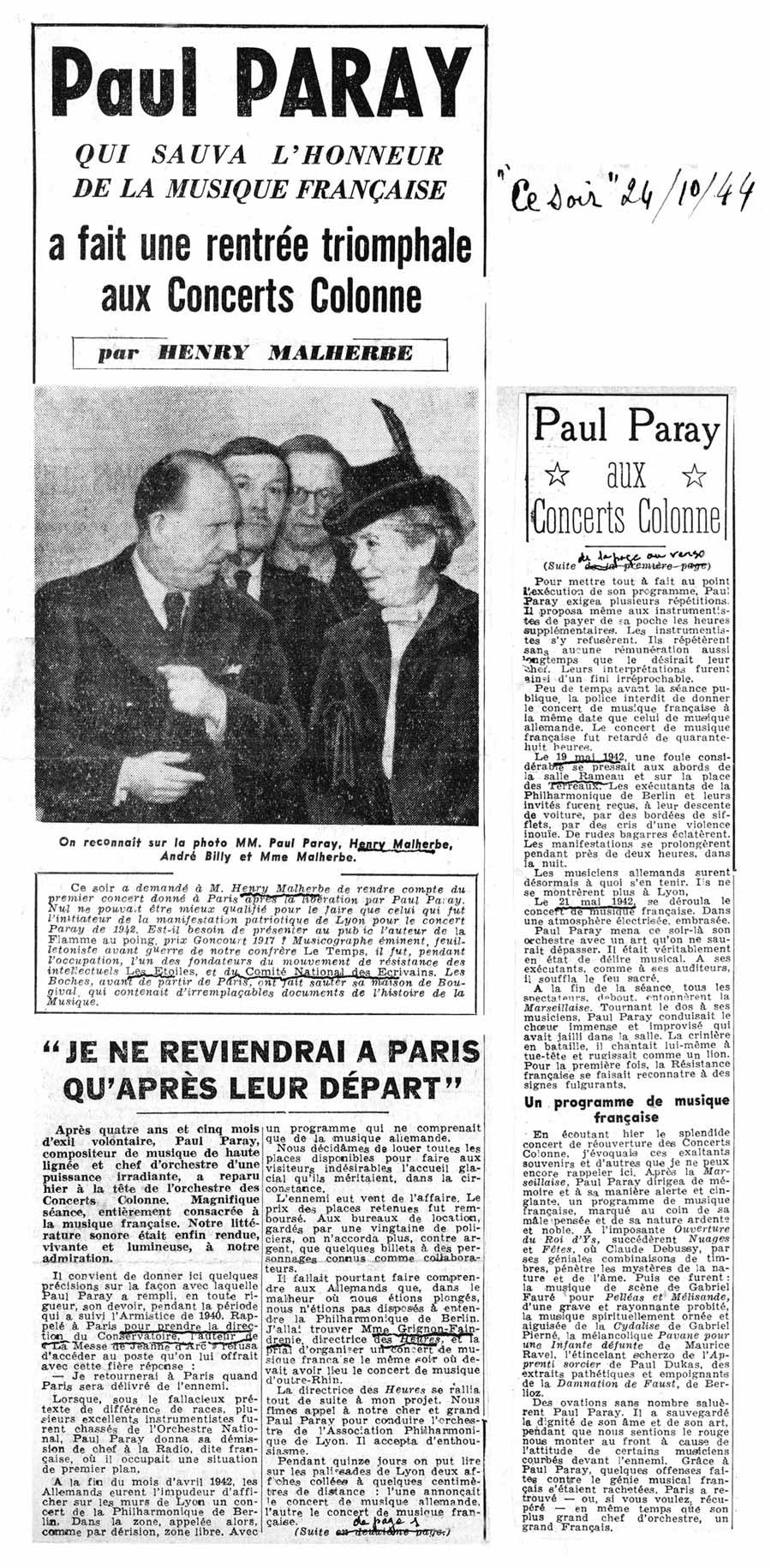 Bientôt absorbé, après la Libération, par la réorganisation de son Orchestre Colonne, ses tournées à travers la France et l'Europe - notamment avec le Philharmonique de Vienne -, la création du nouvel Orchestre philharmonique d'Israël et les concerts qu'il effectue comme chef invité des plus grandes phalanges du continent américain, Paul Paray interrompt son activité de compositeur.