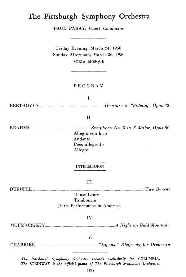 A Detroit comme à Pittsburgh, New-York et Philadelphie, où il est régulièrement invité, Paul Paray prend plaisir à conduire, en marge du répertoire classique et de la musique française, les œuvres de compositeurs américains ou canadiens : Aaron Copland, Samuel Barber, Harold Shapero, James Cohn, Ned Rorem, Walter Piston, Murray Adaskin. A ceux qui s'étonnent qu'il ait lui-même abandonné l'écriture musicale, il répond que "rien ne peut égaler la joie de créer", mais que son travail d'interprète, souvent nourri d'un fécond dialogue avec les auteurs, lui donne "une satisfaction palpable et bien réelle, plus directe que la composition, même si elle est éphémère".
